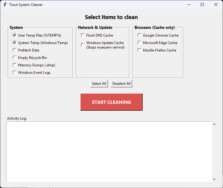 Tired of a sluggish system? Tiwut System Cleaner is a powerful, yet easy-to-use, Python-based utility designed to safely remove common junk files, free up disk space, and enhance your PC's speed. Built with the tkinter GUI for a simple, native Windows experience.